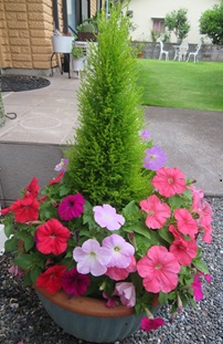 クリスマスの木「ゴールドクレスト」と夏の花「ペチュニア」が仲良く同じ鉢で、元気に咲いてます。
